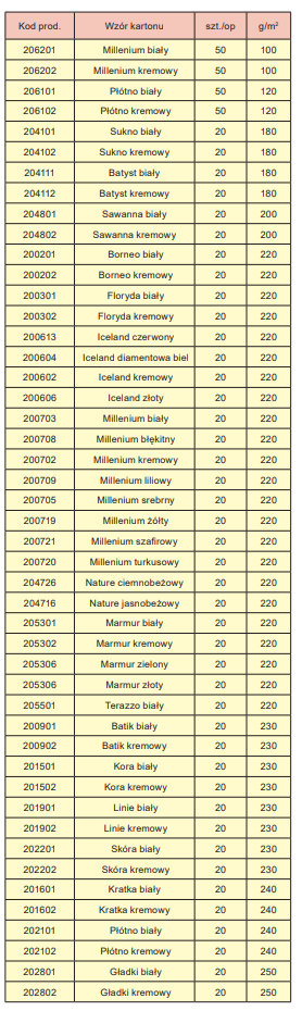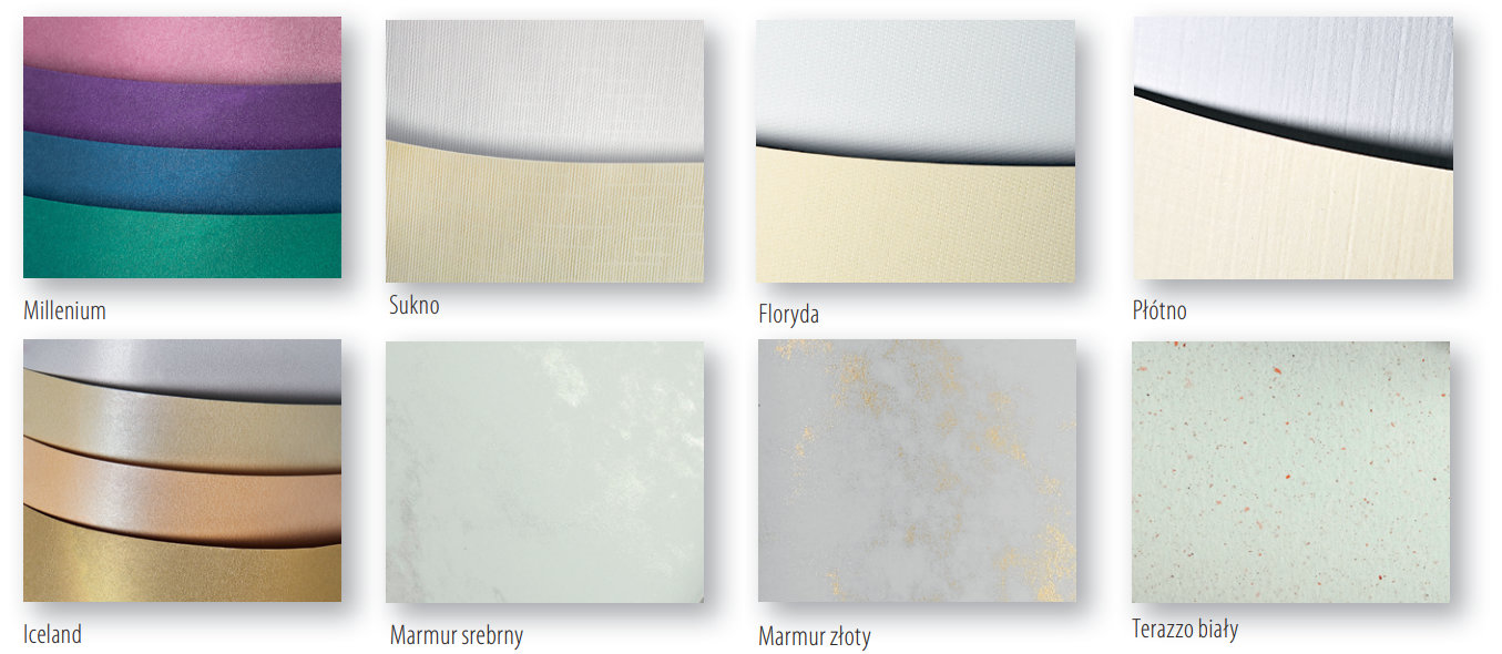OPIS: Efektowne tłoczone i metalizowane kartony do przygotowania zaproszeń, menu, wizytówek, dyplomów, kart okolicznościowych. Karton matowy z wyraźnym tłoczeniem polecamy do drukarek atramentowych, karton metalizowany do drukarek laserowych, wzory gładkie do wszystkich typów drukarek. Opakowanie 20 ark. A4 Ekskluzywny papier ozdobny metalizowany Millenium 100g/m2 i matowy Płótno 120 g/m2 , do druku korespondencji biznesowej, insertów do zaproszeń, podziękowań. Opakowanie 50 ark. A4. |