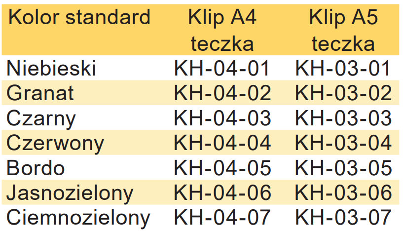 OPIS: Obie okładki sztywne, – wyposażony w sprężysty mechanizm zaciskowy służący do utrzymywania kartek papieru nieruchomo na klipie, – posiada kieszeń na wewnętrznej stronie okładki i uchwyt na długopis, – dostępne w standardowych kolorach oraz z kolekcji NEW COLOURS. |