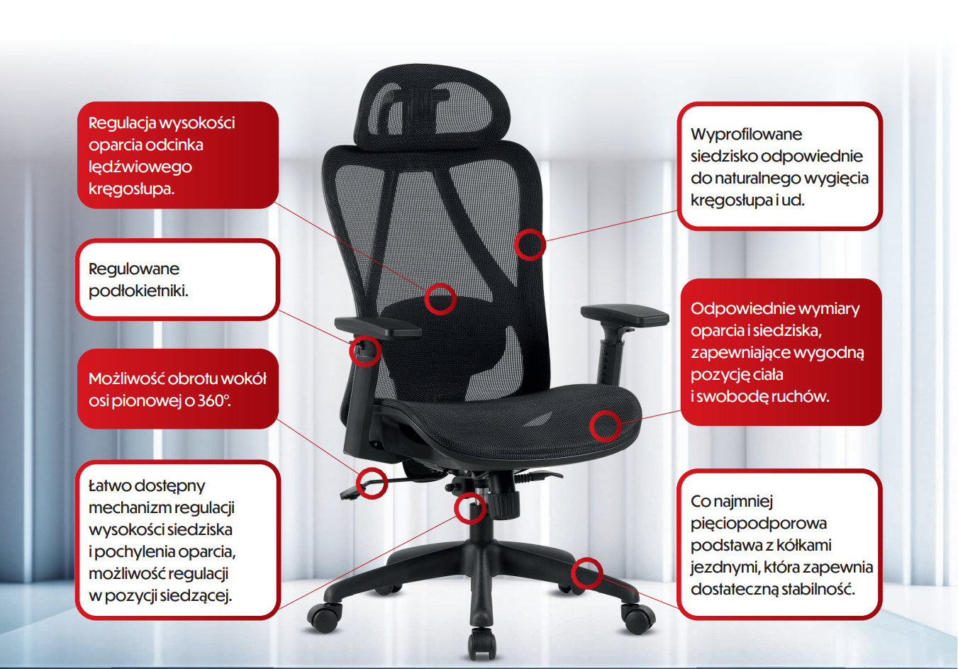 OPIS: Zaprojektowane z myślą o maksymalnym komforcie pracowników. W portfolio marki Office Products znajdują się modele zgodne z wymaganiami rozporządzenia MRiPS z 17 maja 2024 r. dotyczącego BHP na stanowiskach wyposażonych w monitory ekranowe. |